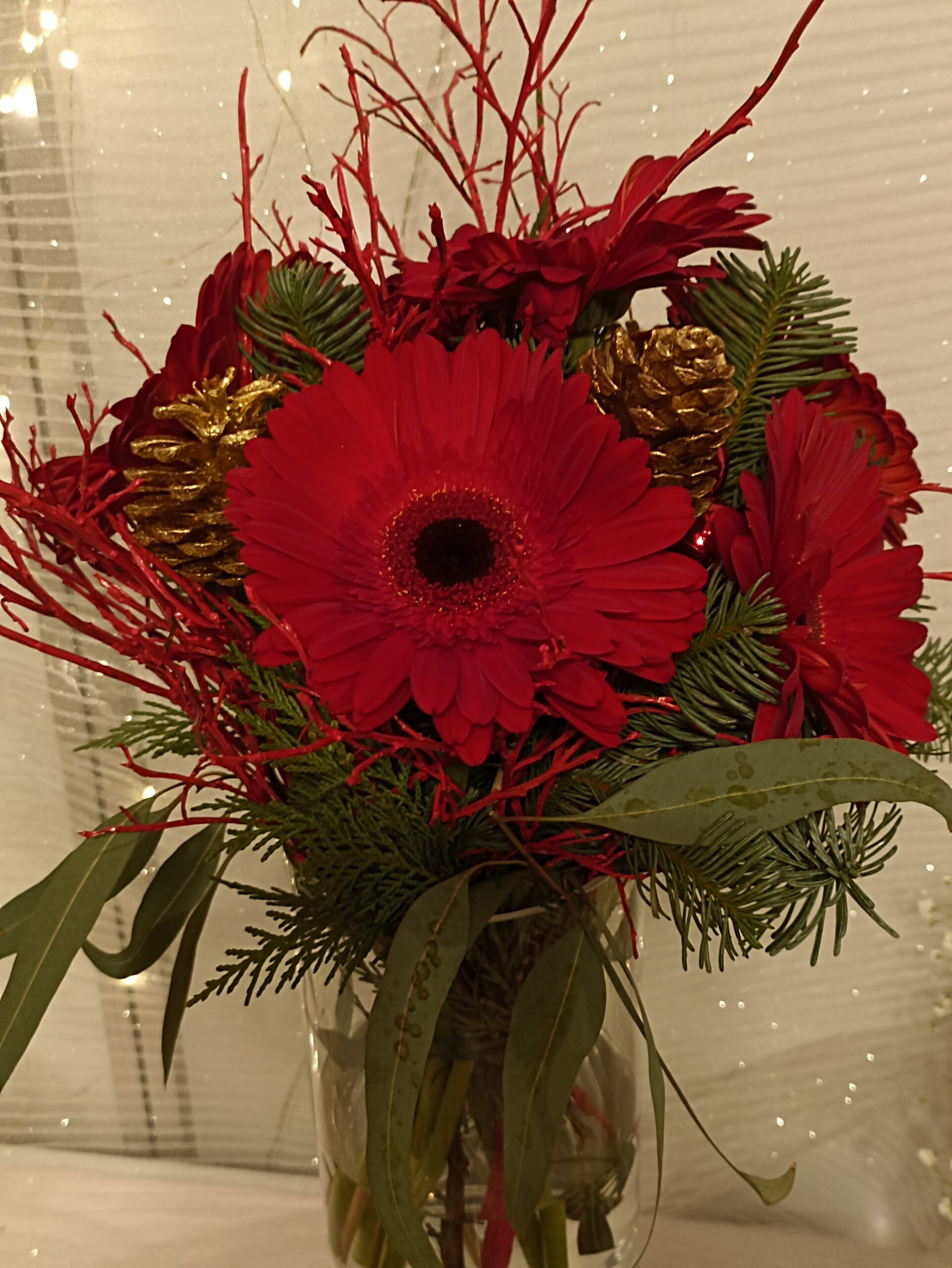 Μπουκέτο με ζέρμπερες κόκκινες ,κουκουνάρια και διάφορες χριστουγεννιάτικες πρασινάδες….